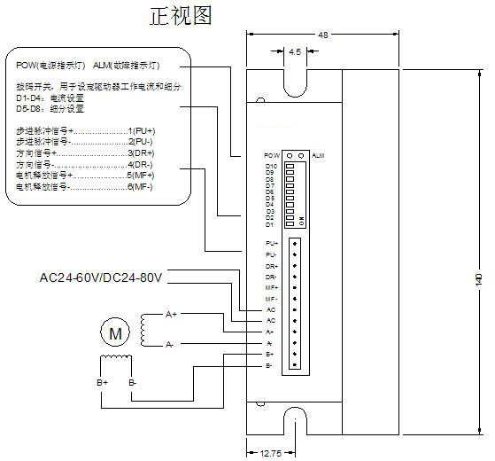 注:可根據(jù)客戶要求定制細(xì)分?jǐn)?shù)! !注意 1、輸入電壓不能超過(guò)AC60V/DC80 2、輸入控制信號(hào)電平為5V,當(dāng)高于5V時(shí)需要接限流電阻; 3、輸入脈沖信號(hào)下降沿有效; 4、驅(qū)動(dòng)器溫度超過(guò)80度時(shí)驅(qū)動(dòng)器停止工作,故障指示燈ALM亮,直到驅(qū)動(dòng)器溫度降到50度時(shí),驅(qū)動(dòng)器需要重新上電才能恢復(fù)工作。出現(xiàn)過(guò)熱保護(hù)請(qǐng)加裝散熱器; 5、過(guò)流(負(fù)載短路)故障指示燈ALM亮,請(qǐng)檢查電機(jī)接線及其他短路故障,排除后需要重新上電恢復(fù); 6、無(wú)電機(jī)故障指示燈ALM亮,請(qǐng)檢查電機(jī)接線,排除后需要重新上電恢復(fù)。 驅(qū)動(dòng)器接線、尺寸示意圖