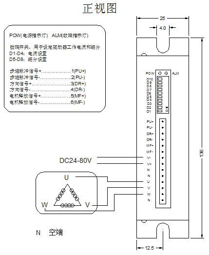 注:可根據(jù)客戶要求定制細(xì)分?jǐn)?shù)! !注意 1、輸入電壓不能超過DC80V; 2、輸入控制信號電平為5V,當(dāng)高于5V時需要接限流電阻; 3、輸入脈沖信號下降沿有效; 4、驅(qū)動器溫度超過80度時驅(qū)動器停止工作,故障指示燈ALM亮,直到驅(qū)動器溫度降到50度時,驅(qū)動器需要重新上電才能恢復(fù)工作。出現(xiàn)過熱保護(hù)請加裝散熱器; 5、過流(負(fù)載短路)故障指示燈ALM亮,請檢查電機(jī)接線及其他短路故障,排除后需要重新上電恢復(fù); 6、無電機(jī)故障指示燈ALM亮,請檢查電機(jī)接線,排除后需要重新上電恢復(fù)。 驅(qū)動器接線、尺寸示意圖